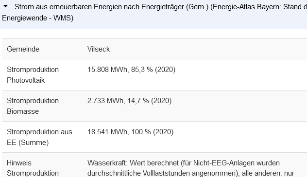 Laut letzten Daten aus dem Energieatlas (2020) habe die Stadt Vilseck in 2020 zirka 18.500 MWh Strom aus Erneuerbaren Energien (EE) erzeugt. Der gesamte Stromverbrauch der Stadt wurde mit rund 20.000 MWh angegeben. Daraus resultiere ein Anteil von 92,5 % aus im Stadtgebiet erzeugten Strom aus EE.