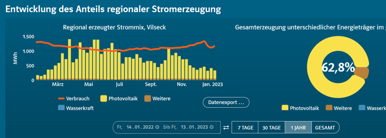 Laut letzten Daten aus dem Energiemonitor (2022) habe die Stadt Vilseck in 2020 zirka knapp 40.000 MWh Strom aus Erneuerbaren Energien erzeugt. Diese Steigerung sei die Folge der neuen Solarparks, die inzwischen ans Netz gingen. Der gesamte Stromverbrauch der Stadt wurde mit rund 60.000 MWh angegeben. Daraus resultiere ein Anteil von rund 63 % aus im Stadtgebiet erzeugten Strom aus EE.
