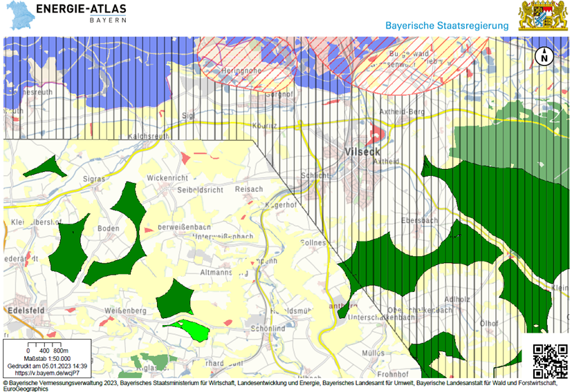 Beim Blick auf die lokale Landkarte (siehe Anlage, öffentlich per Beamer des Sitzungssaales) des Energieatlas (Wind) werde deutlich, dass im Gemeindegebiet der Stadt Vilseck an drei oder vier Stellen geeignete Flächen dafür vorhanden seien. Diese Flächen lägen an den Gemeindegrenzen zu Edelsfeld (Raum Wickenricht-Altmannsberg), zu Hahnbach (Hohenzant) und zu Freihung (Staatswald Ebersbach). Die Auswahl möglicher Standorte werde eingeschränkt durch militärische Schutzzonen, die auf der Karte schraffiert dargestellt werden.
