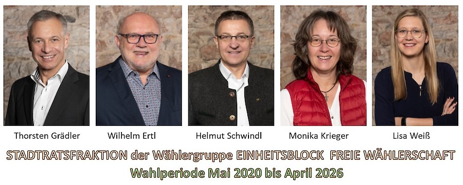 Ein hohes Maß an Zufriedenheit herrscht bei unserer Wählergruppe Einheitsblock Freie Wählerschaft mit dem Ausgang der Stadtrats- und Kreistagswahl. Mit Stimmenkönig Thorsten Grädler, den amtierenden Räten Wilhelm Ertl, Helmut Schwindl und Monika Krieger sowie der Neueinsteigerin Lisa Weiß sind wir auch im neuen Stadtrat gut vertreten.